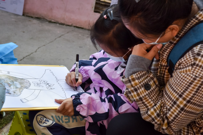 五岁的王若宇小朋友在妈妈的帮助下,用心地画着他心中的“大猫”。孩子妈妈感慨的说,能在雪豹实践地开展主题活动,对孩子们获益匪浅,特别是大家一起喊出的口号“保护雪豹,从我做起”,这句话将会在孩子们幼小的心里扎下深根,树立起他们热爱生态、保护生态的理念。