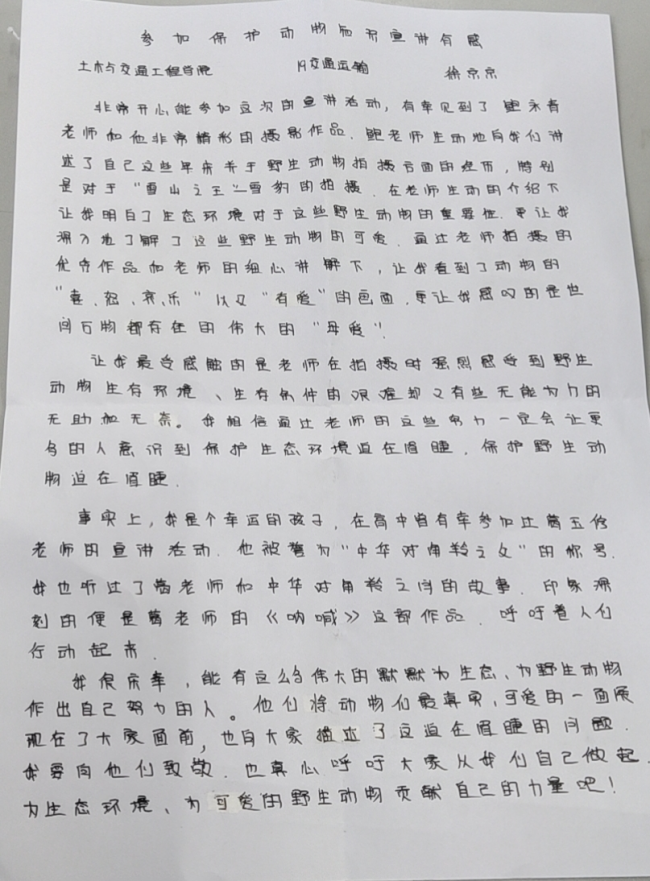 听完讲座,同学们纷纷围拢在鲍老师身边,细细观看雪豹、兔狲、藏狐,他们的眼中透出好奇和向往,有同学说,这是第一次通过镜头去关注保护,尤其能看到著名的摄影师老师分享保护故事,鼓励大学生树立正确的价值观,从简从朴,踏实用心,深受启发。