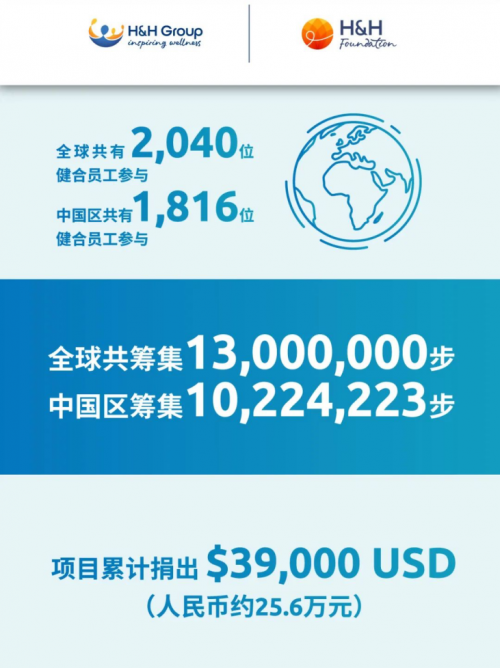 此次活动,健合集团中国区共有1,816名健合志愿者参与,合计捐赠10,224,223步,最高捐赠者捐出了41,811步,有30位志愿者捐赠步数超过30,000步;由于中国区活动反响热烈,最终H&H基金决定对捐赠步数进行双倍捐赠,为“快乐操场”项目助力,用切实行动点燃公益之光。
