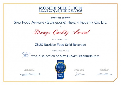 2020世界品质评鉴大会铜奖荣誉