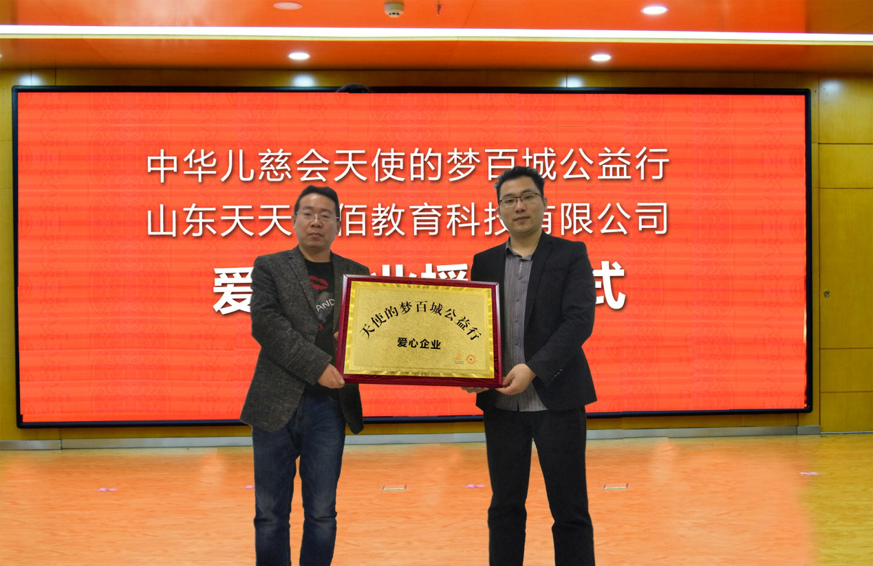 在众多知名公益基金会组织和各界爱心人士以及各级相关部门领导的见证下,中华儿慈会天使的梦专项基金公益事业部主任兼天使的梦百城公益行山东爱心服务站站长李超为天天易佰教育颁发爱心企业荣誉。
