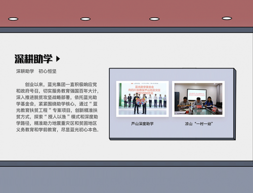 此次公益蓝光云博馆采用了互联网最具传播力的H5,兼具图文、视频等多种展现元素,并主要通过设置深耕助学、赈灾助危、扶贫助弱和荣誉蓝光等四个板块的公益展厅,系统回溯了公益蓝光30年的每一步温暖历程,也通过钩沉30年铿锵历程中一件件重要的公益行动,生动展现蓝光人不忘初心、自觉担当的公益坚守。