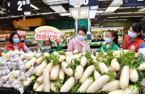 12月5日,贵州贫困山区的孩子们被邀请到万家客村店,为来自家乡毕节的农产品“代言”,开展“小小代言人”销售体验活动。11个孩子们分成三组,分别“代言”同样来自毕节的鸡蛋、白萝卜和大白菜。孩子们纷纷化身“小小代言人”,使出“十八般武艺”推销家乡扶贫产品,吸引了不少消费者前来选购。