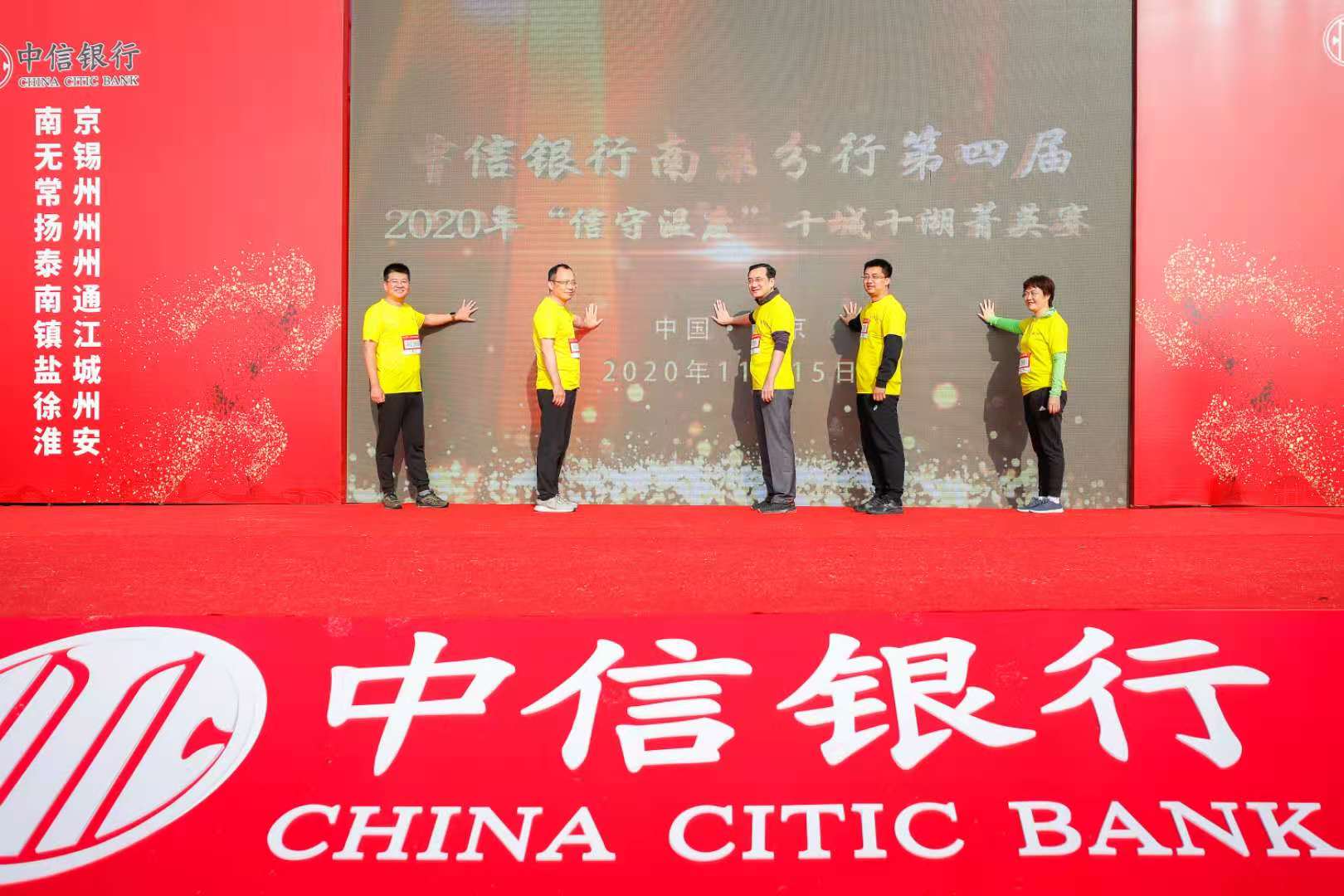 江苏省内十城市联动,同步鸣枪开跑。11月15日上午8:30分,中信银行南京分行2020“信守温度·十城十湖菁英赛”南京站在秋色缤纷的玄武湖风景区开赛。同一时间,中信银行南京分行辖内无锡、常州、扬州、泰州、南通、镇江、盐城、徐州、淮安等9家分行,共约4000名选手同步开跑。中信银行南京分行副行长周捷、纪委书记陈小玲、行长助理孙继华、行长助理徐震等出席活动。